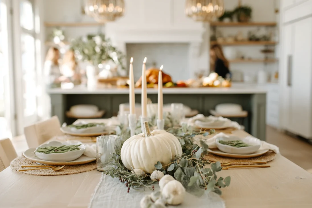 Soft candles, a simple pumpkin centerpiece, and fresh sides coming together—quiet Thanksgiving prep in a bright, welcoming kitchen.