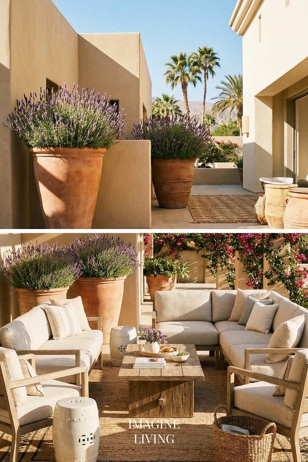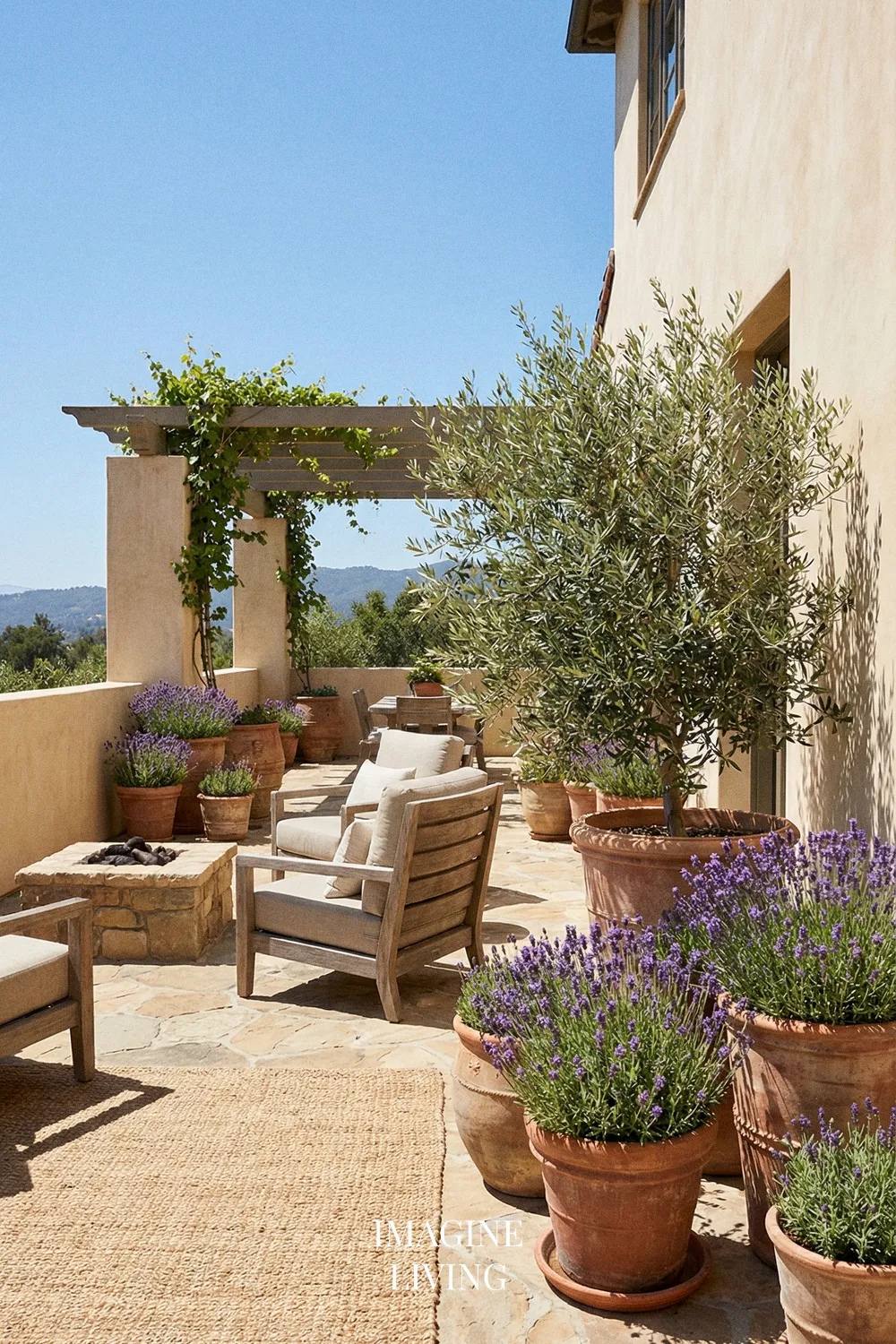 This idea works especially well because lavender brings both structure and movement. The silvery-green foliage looks beautiful even before the flowers open, and the purple bloom spikes add color without overwhelming a refined outdoor palette. It pairs especially well with terracotta pots, olive trees, neutral lounge cushions, and natural textures.