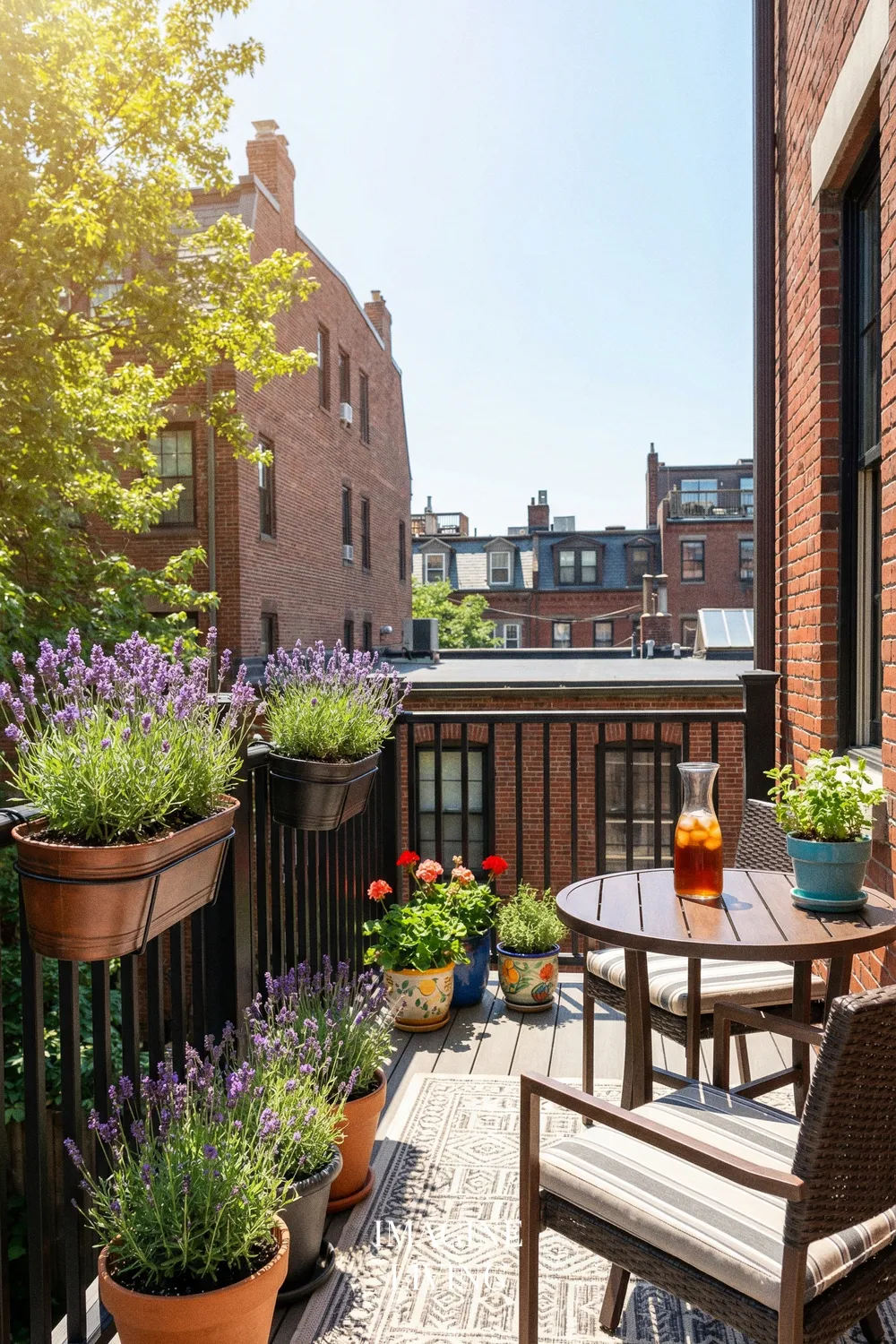 Lavender has a naturally romantic quality, and on a balcony with soft textiles, small café furniture, and gentle summer styling, it can create a very pretty outdoor retreat. It adds color and fragrance while keeping the scene grounded in something living and seasonal.
