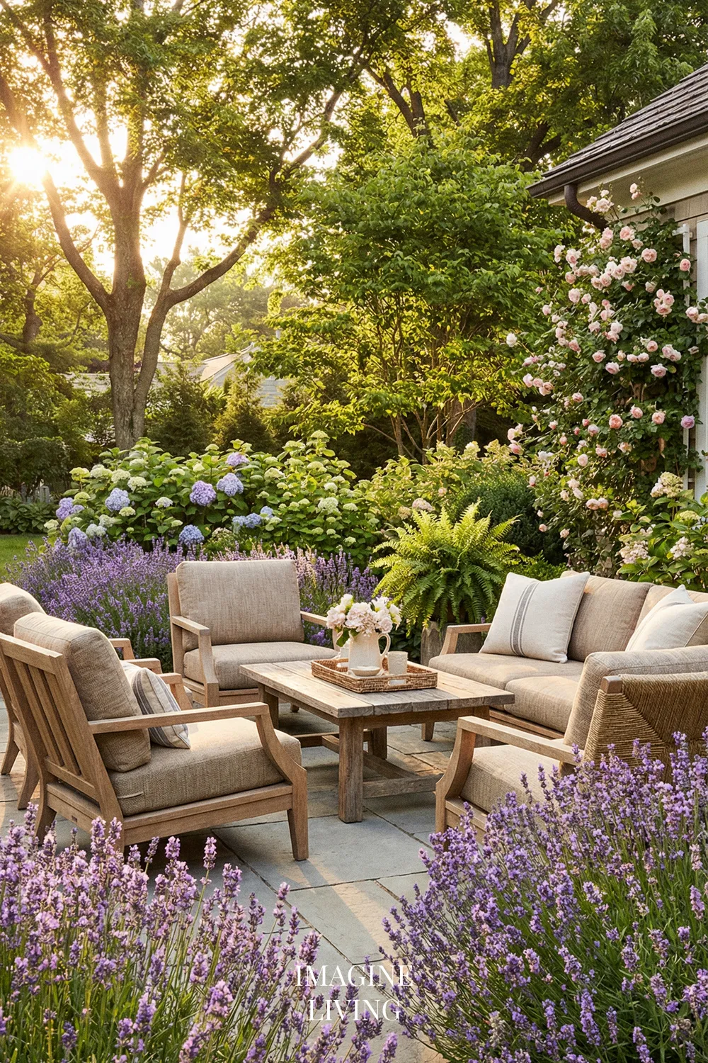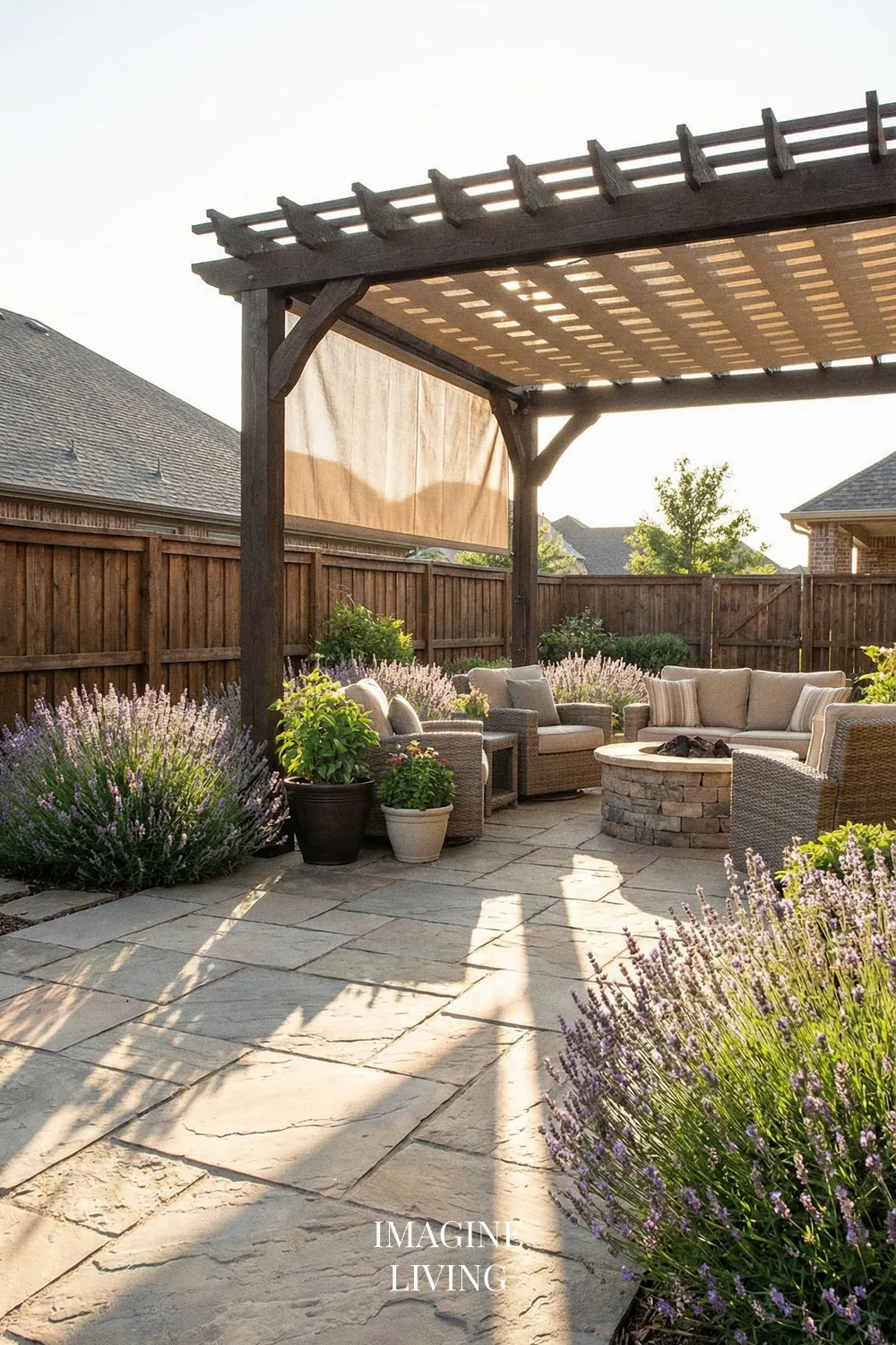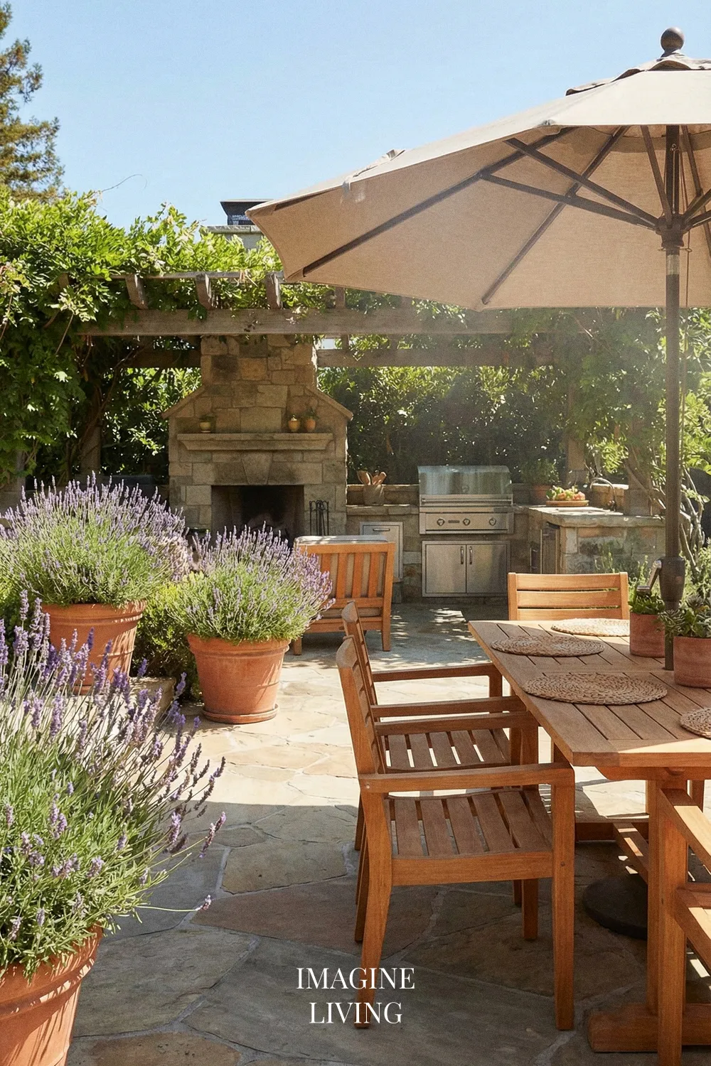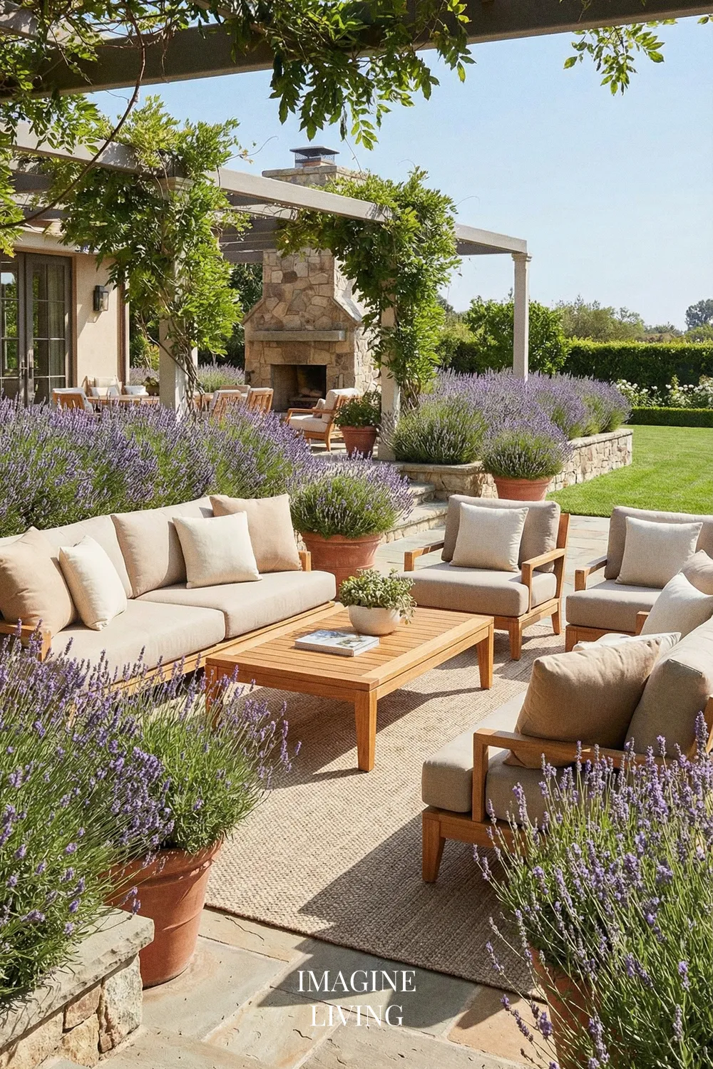 Lavender looks especially beautiful with natural stone and warm wood because all three materials share an organic, grounded quality. Together they create a patio that feels earthy, warm, and relaxed, while still having enough texture and contrast to feel visually rich.