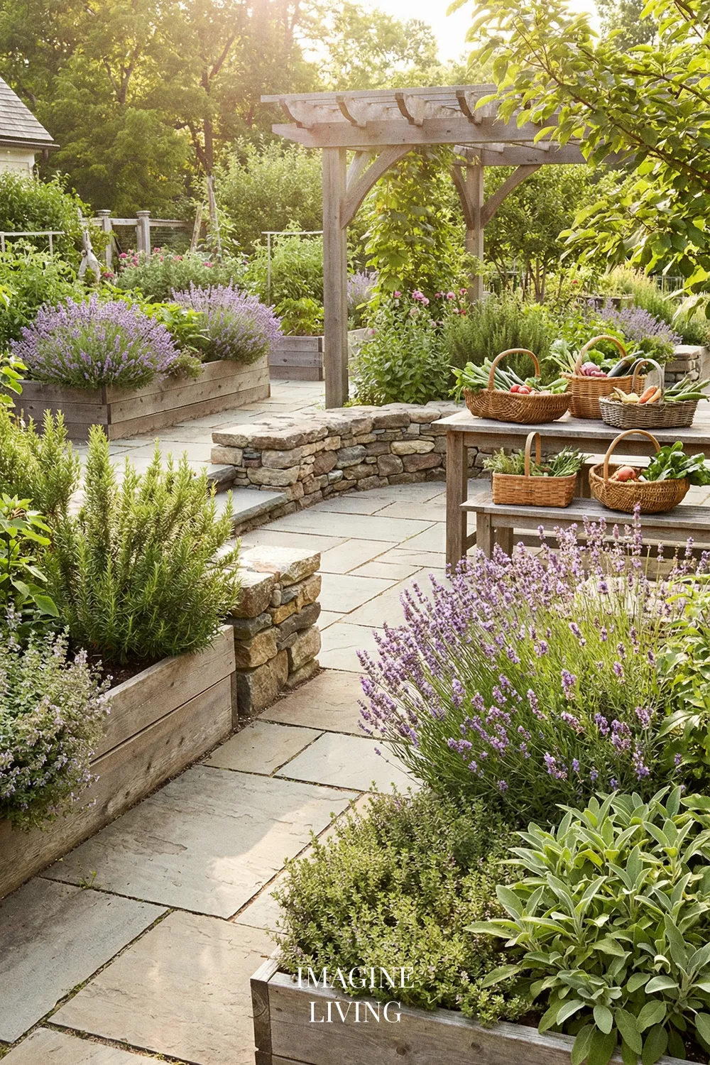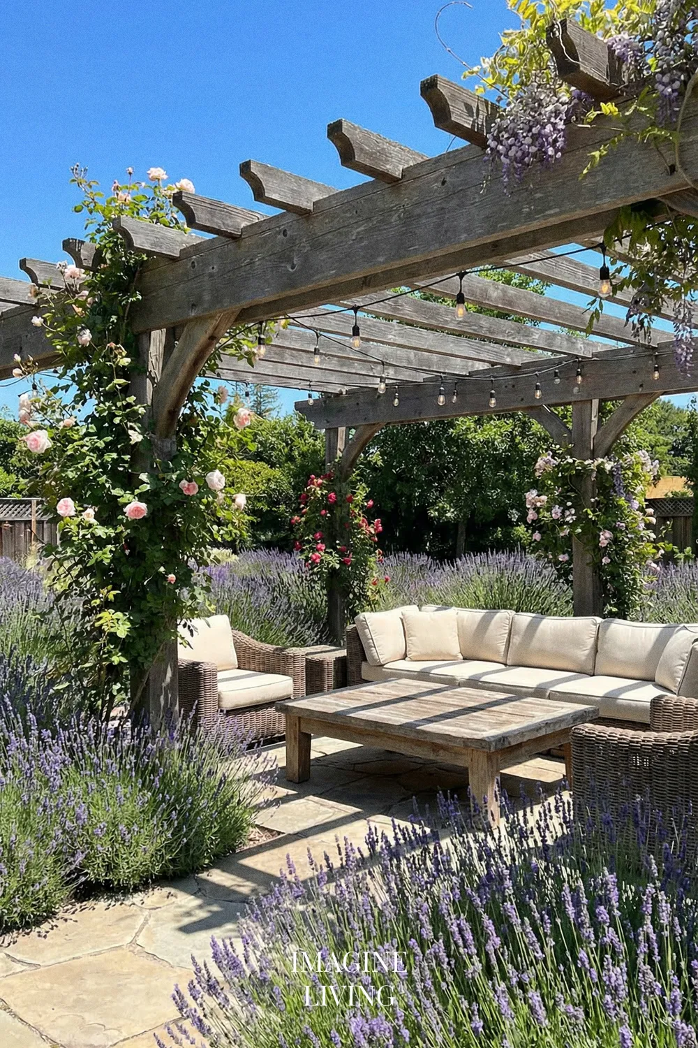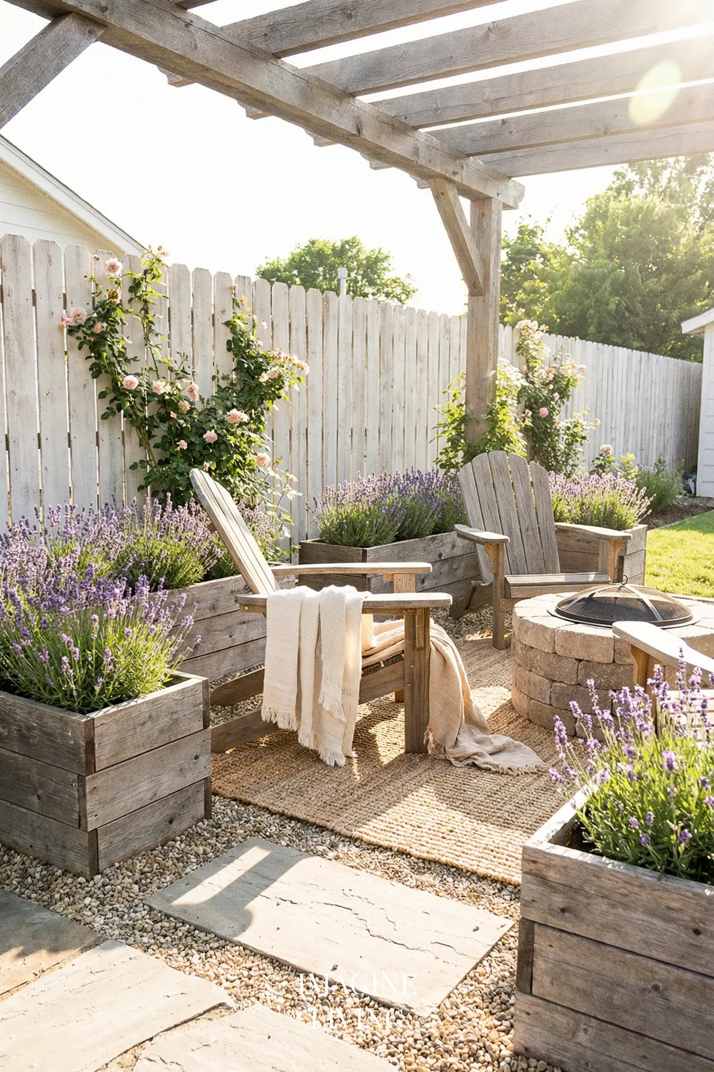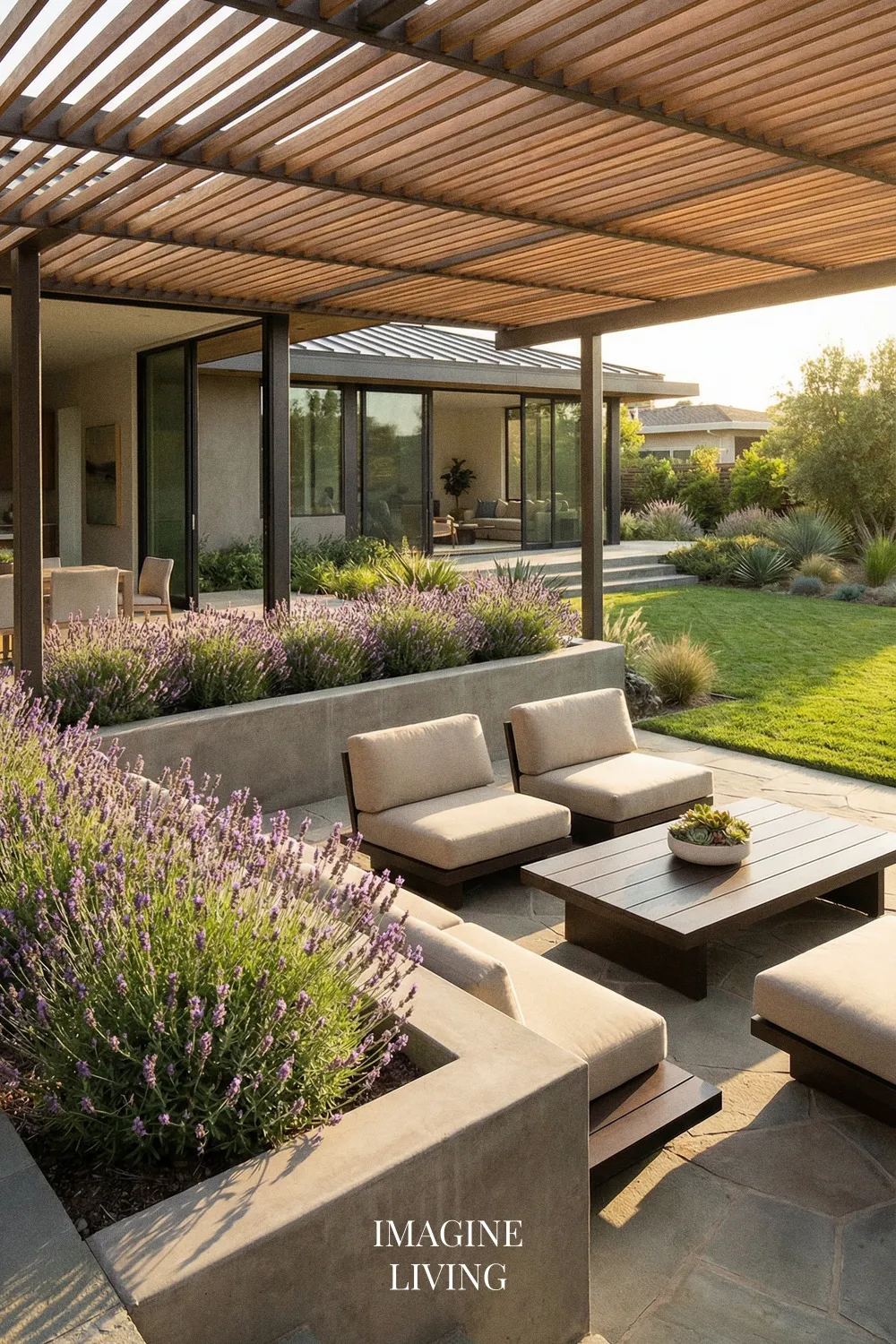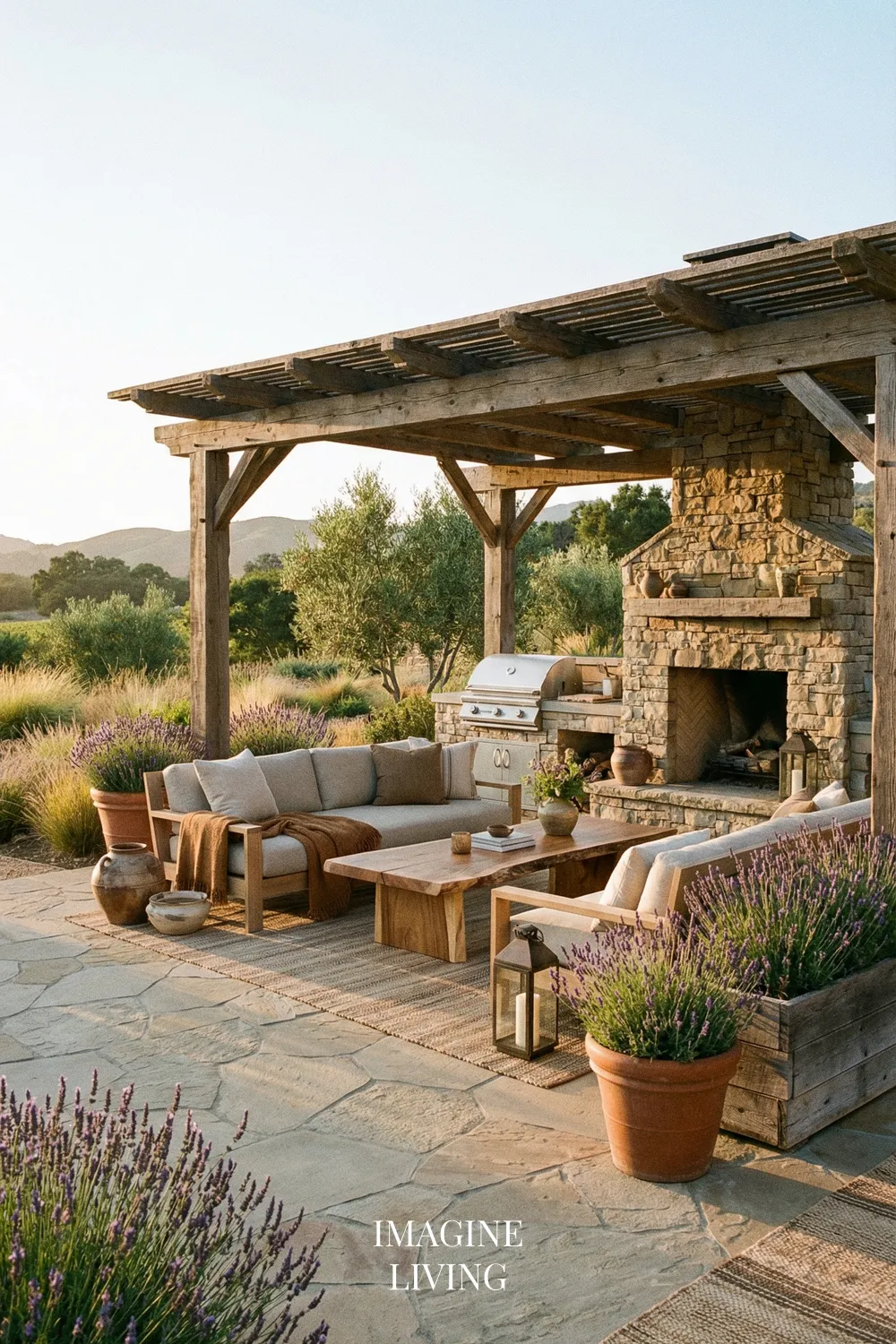 Lavender looks especially beautiful with natural stone and warm wood because all three materials share an organic, grounded quality. Together they create a patio that feels earthy, warm, and relaxed, while still having enough texture and contrast to feel visually rich.