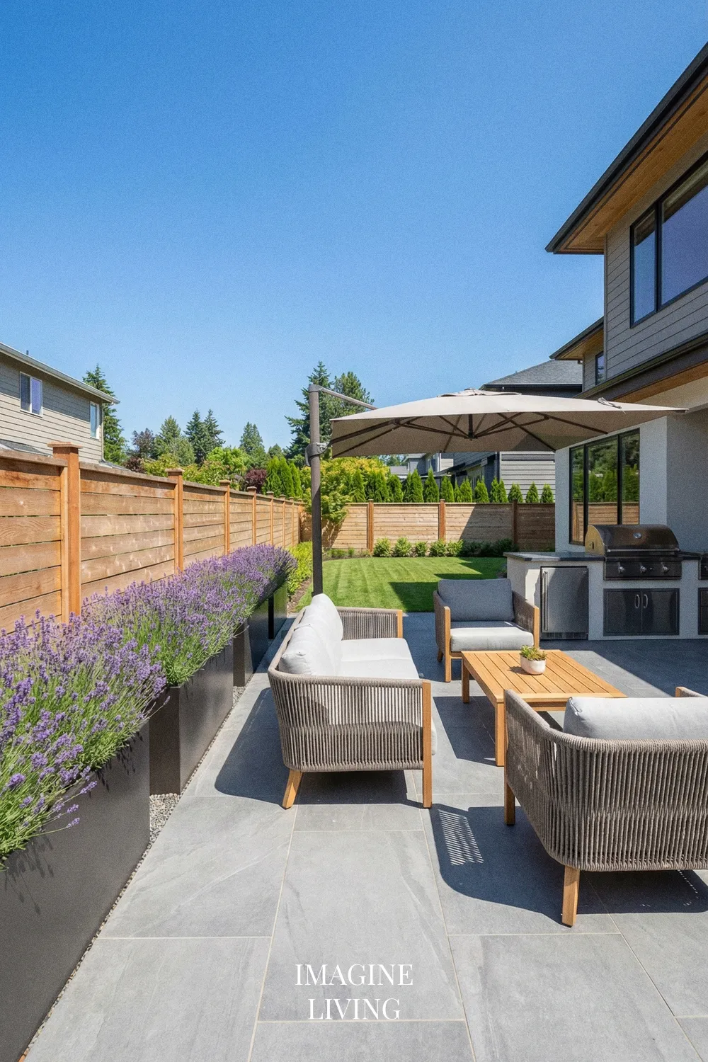 This is a great setup for entertaining areas because lavender adds scent and color without becoming too visually heavy. It can frame the space, define edges, and make paved zones feel greener and more welcoming. It also works across a range of American backyard styles, from traditional patios to more modern outdoor rooms.