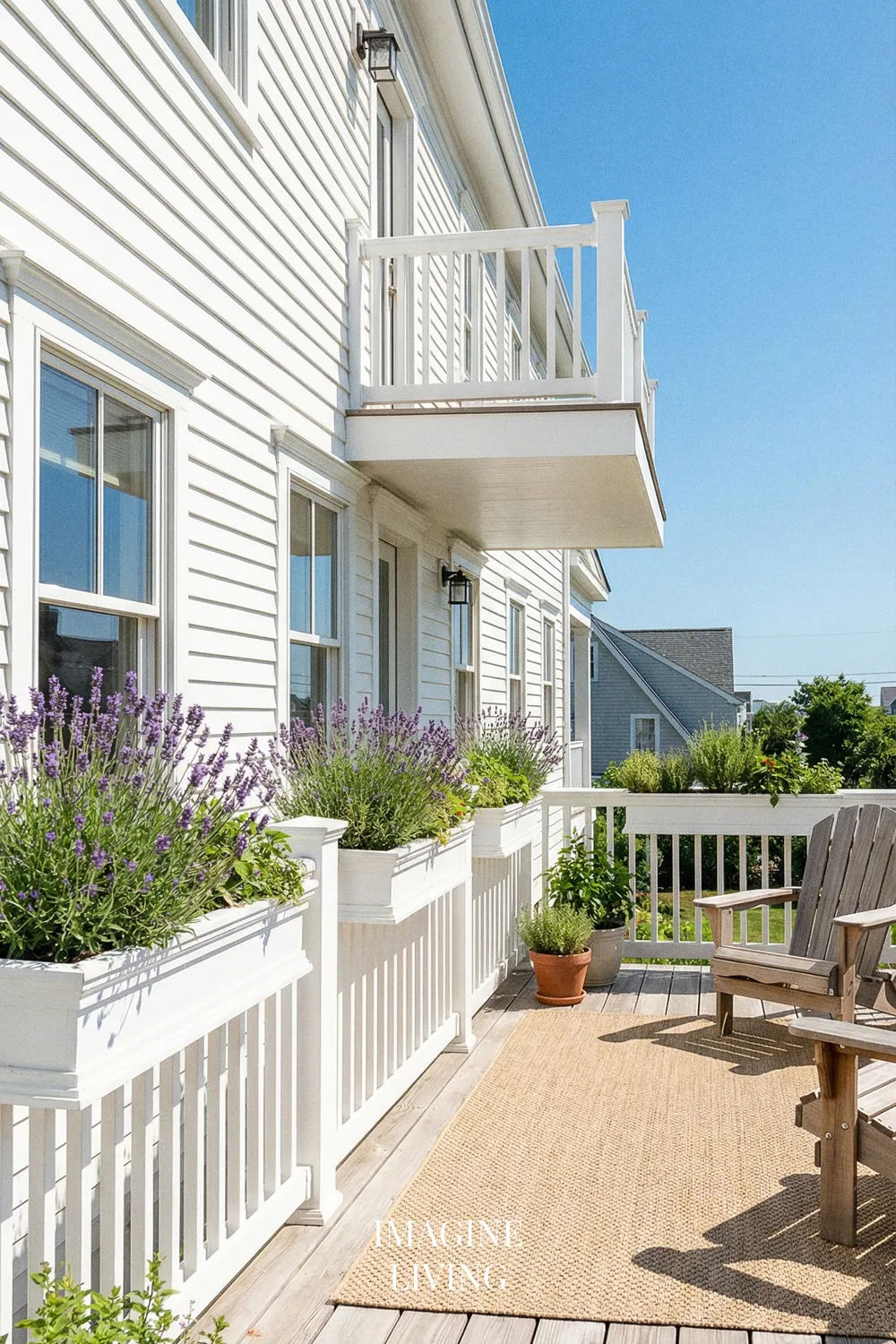 Lavender in railing planters or balcony boxes is a simple way to bring color to eye level. It makes a small outdoor area feel more generous and more lush, especially when the planting is repeated along the edge of the space. It also works well for decks and porches where ground planting is limited.