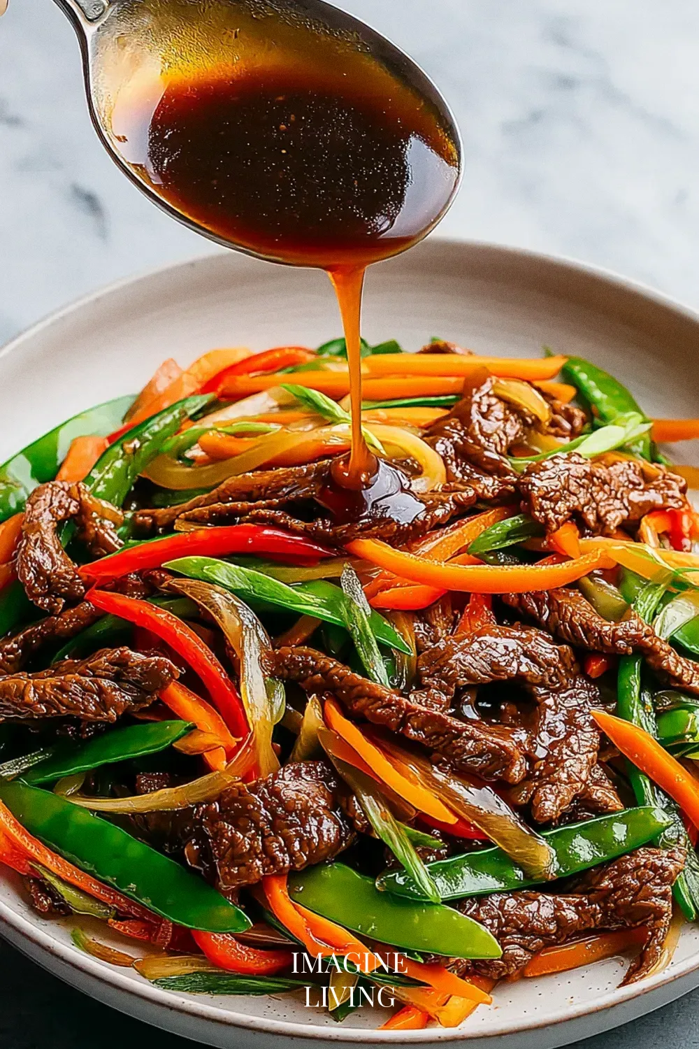 Pour the remaining sauce over the beef and vegetables, stirring everything together for about a minute until the sauce thickens and coats the pan’s contents.