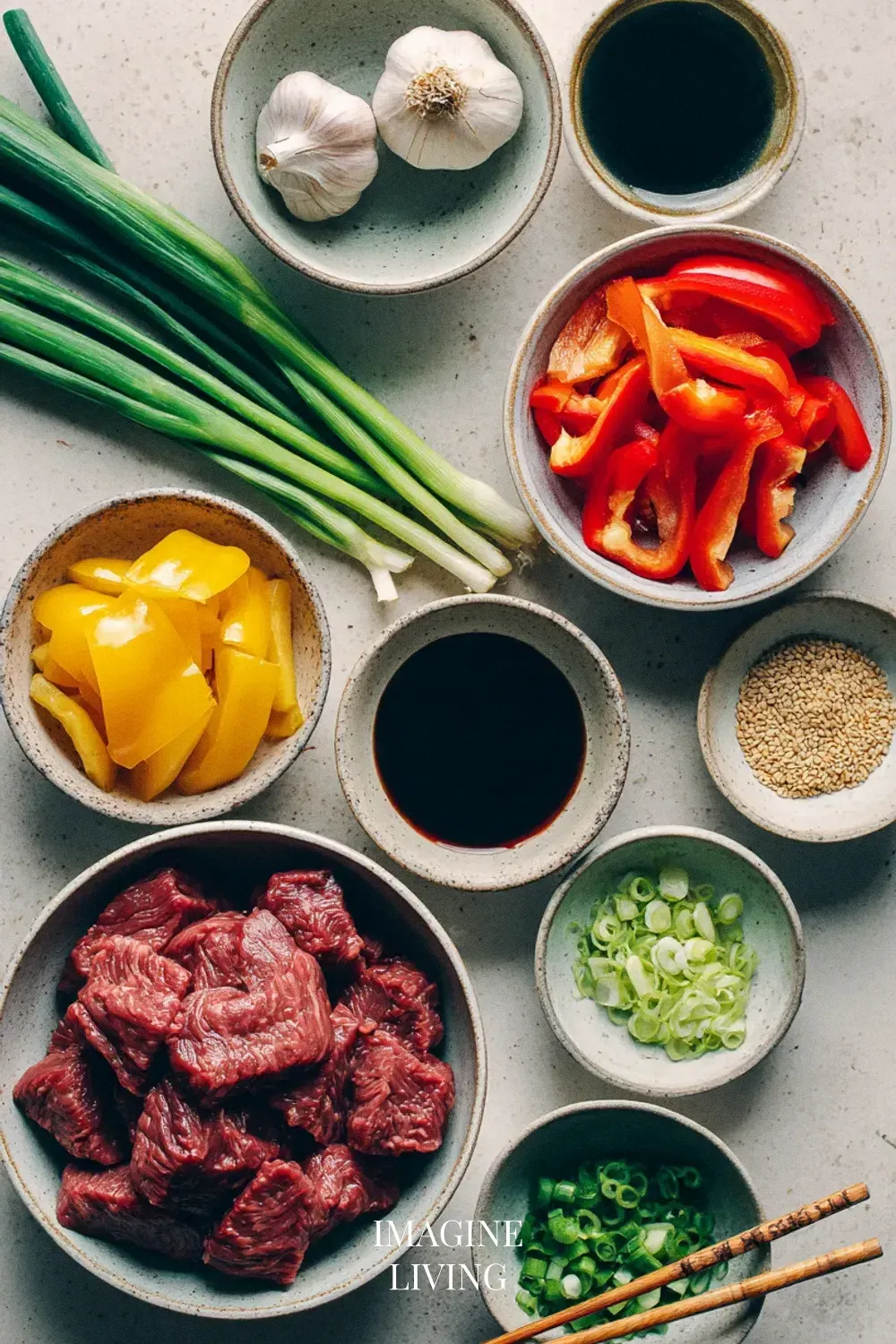 Add the sliced beef to the sauce, coating it thoroughly. Let it marinate for about 10-15 minutes while you prep your vegetables. —It’s a nice moment to take a breath before the quick cooking begins.