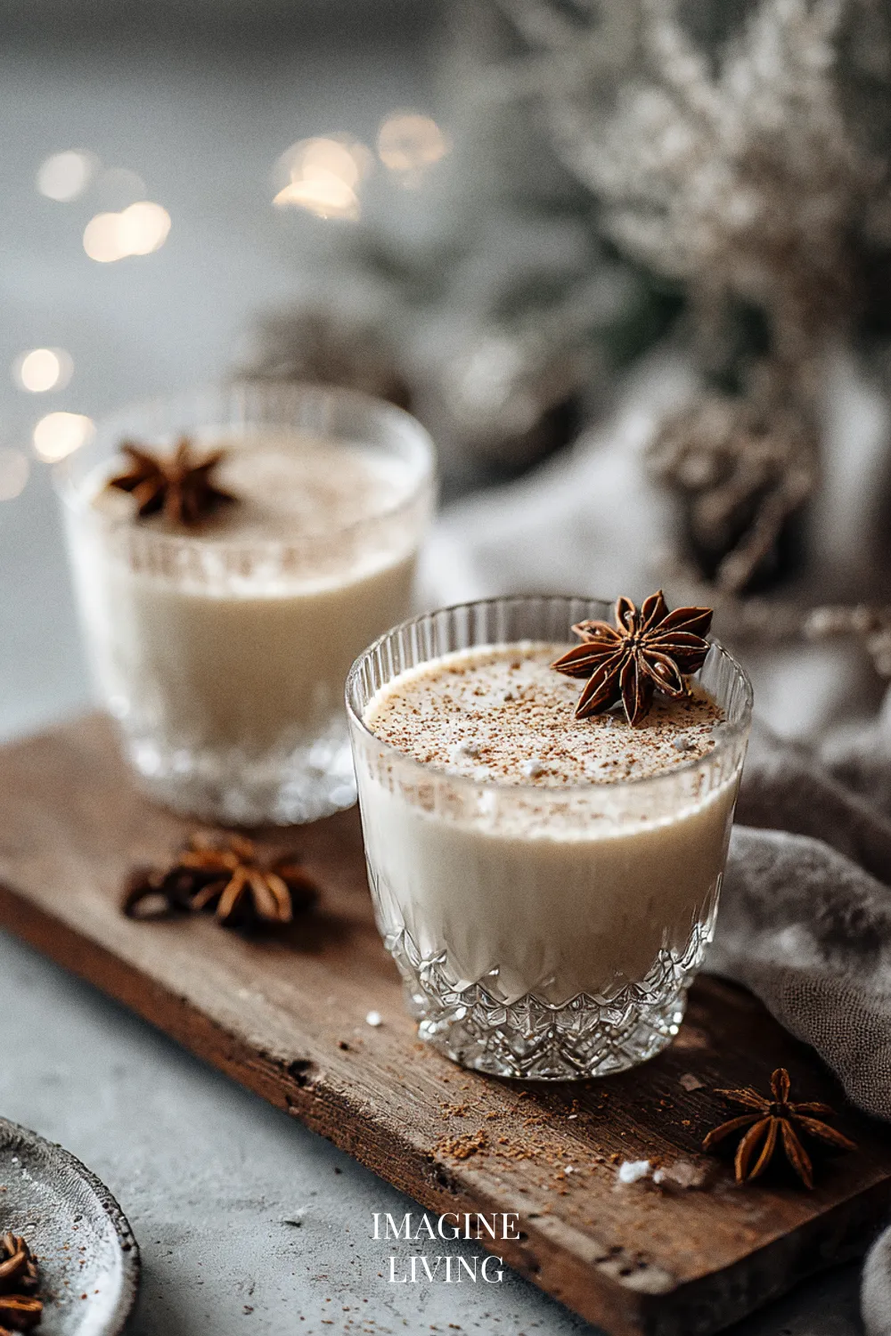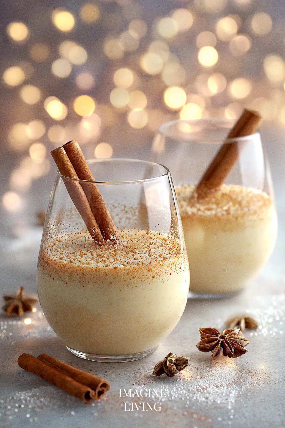 - Serve in glasses, garnished with freshly grated nutmeg, cinnamon sticks, or whipped cream.