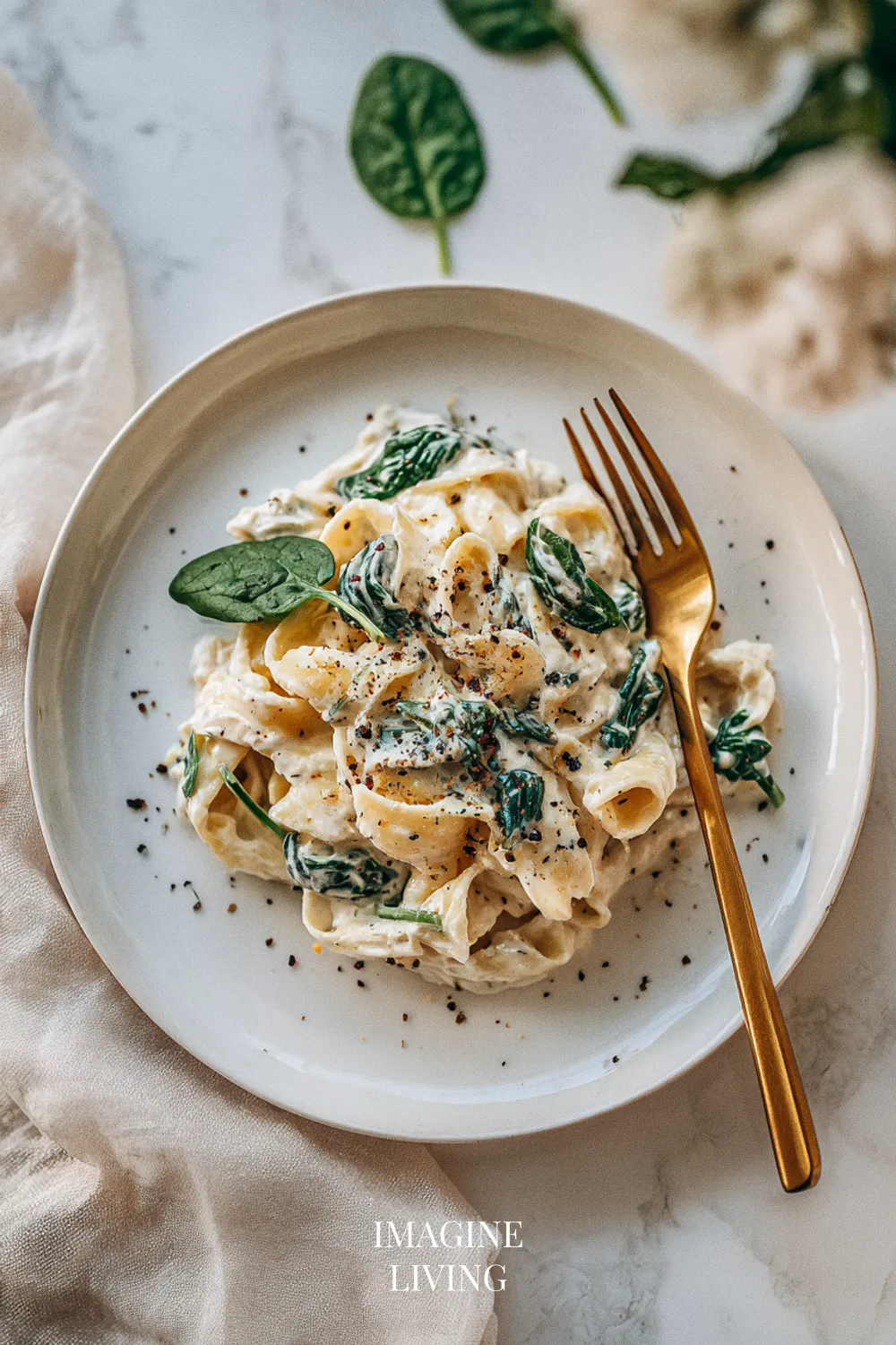 Creamy pasta hits the senses right away—the gentle steam, the soft garlic in the air. As you start this one, there’s a quiet ease to it, like settling into a rhythm you already know. And if anything feels fussy at first glance, it settles down quickly once the sauce comes together. Even a rich dish like this has room for a small smile—spinach always looks like far too much until it melts into almost nothing.
