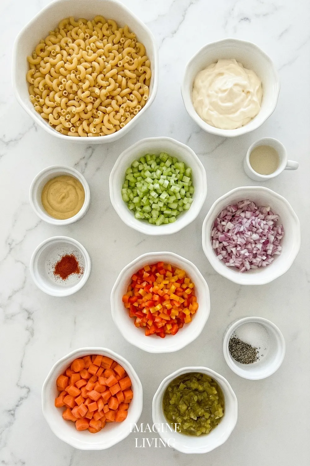 Start by bringing a large pot of salted water to a boil. Add the elbow macaroni and cook until tender, about 8-10 minutes. Drain the pasta in a colander and let it cool completely, allowing the flavors to absorb later without any steaming. — The pasta always looks a bit too firm at first, then softens just enough as it cools.