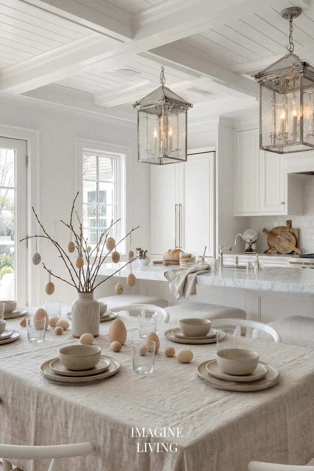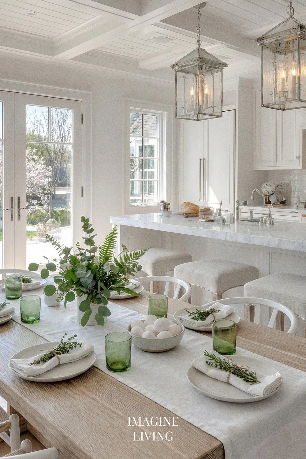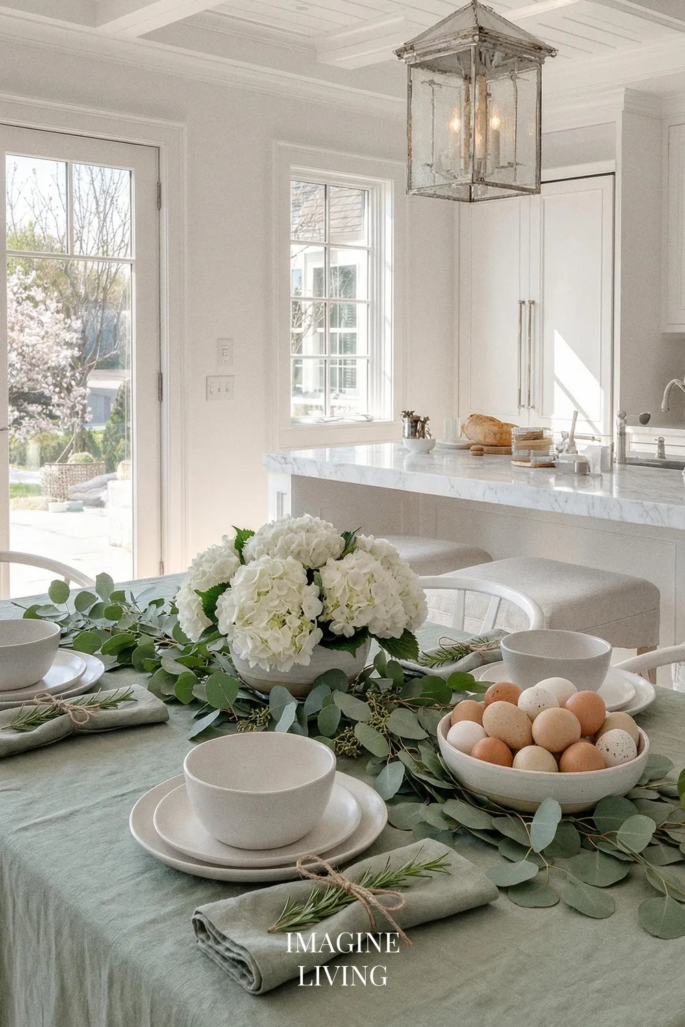 This setting feels almost culinary—fresh, clean, and very “Imagine Living.” Use white stoneware plates, green glass tumblers, and a simple linen runner. Tie napkins with herbs like thyme or rosemary for a detail that looks styled and smells amazing. Instead of a big centerpiece, use a beautiful bowl of clean white eggs plus a low line of greenery to keep everything light and modern.