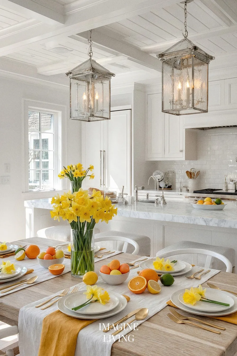 White-on-white styling makes the table feel crisp and expensive, and lemon accents add that instant warm-day energy. A thin striped runner in lemon yellow works beautifully here, paired with clean white plates, clear glassware, and a bowl of citrus as a centerpiece accent. Add white ranunculus or small white blooms to keep it bright, and consider a carafe of citrus water for a detail that looks editorial and feels practical.