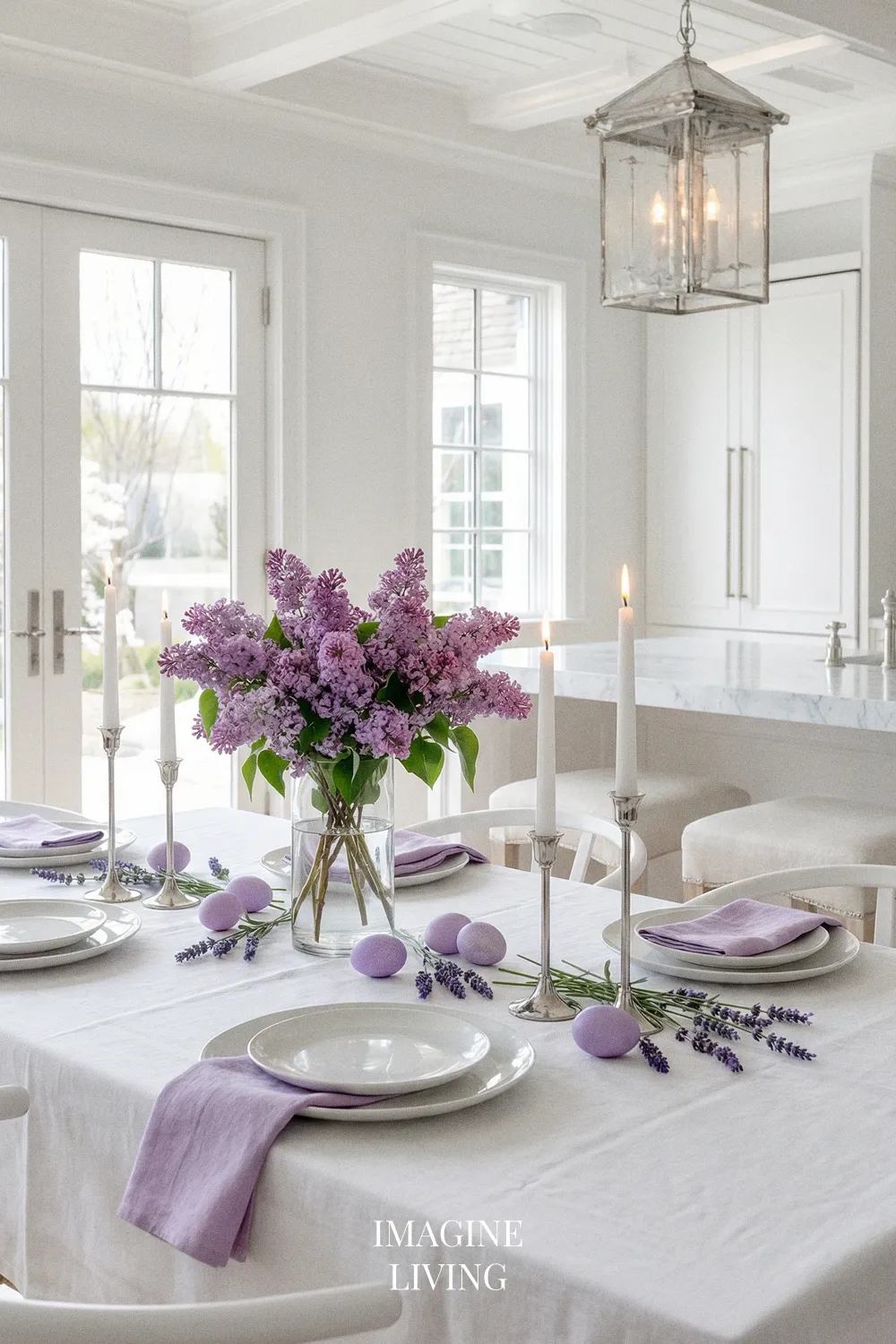 Lavender works best when it’s restrained. Start with a bright white table, then add lavender napkins, lilacs in a clear vase, and subtle silver details—candlesticks, flatware, or even a small silver tray. Keep the eggs minimal and tonal (white and lavender), and avoid over-floral patterns. The overall effect is modern, clean, and quietly festive.