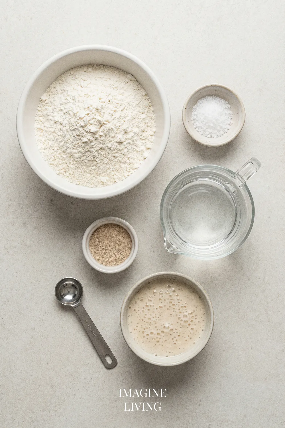 • In a large mixing bowl, combine the flour, salt, and sugar. Then, pour in the activated yeast mixture. Stir until a shaggy dough forms, bringing together any stray bits of flour.
