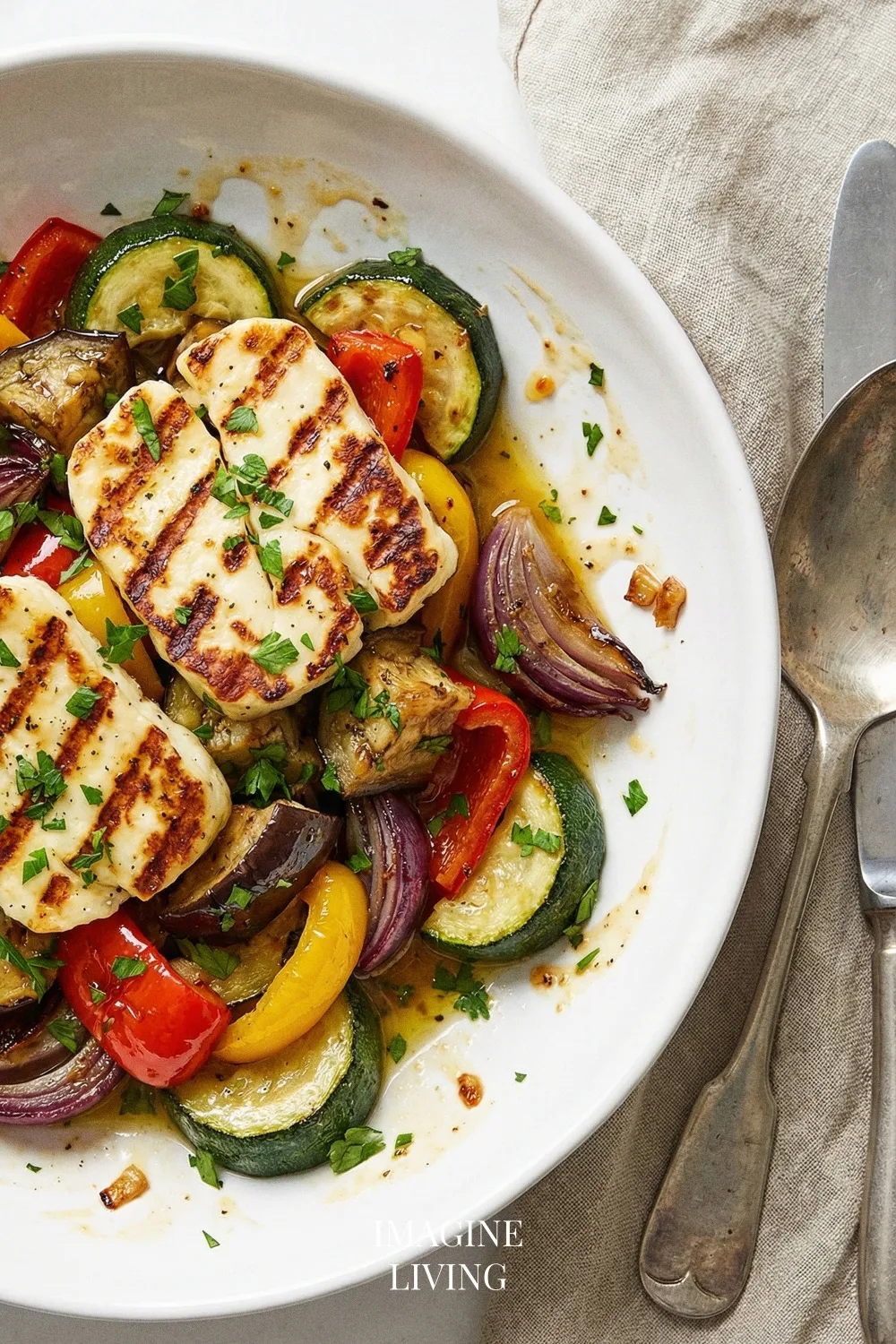 Pro tips: Choose fresh, seasonal vegetables for the best flavor. If you prefer, marinate the halloumi in a bit of olive oil and herbs for extra flavor. For added texture, sprinkle toasted nuts or seeds over the salad before serving. Pair with a crusty loaf of bread to soak up the delicious juices. Enjoy as a main dish or a hearty side.