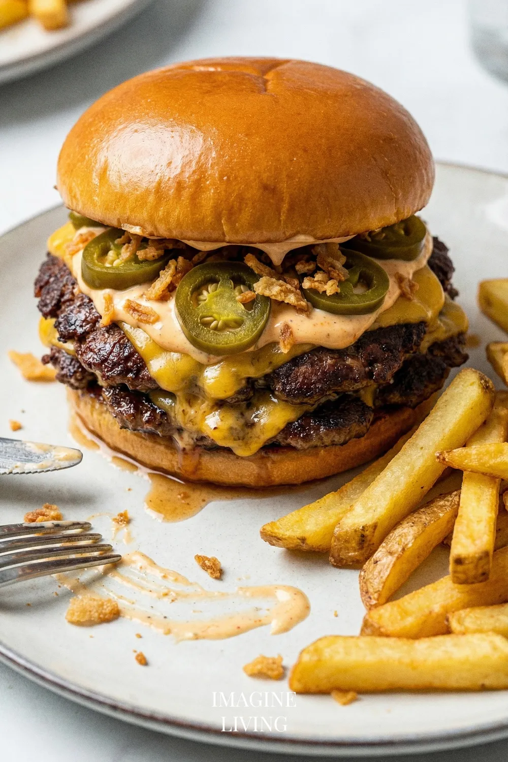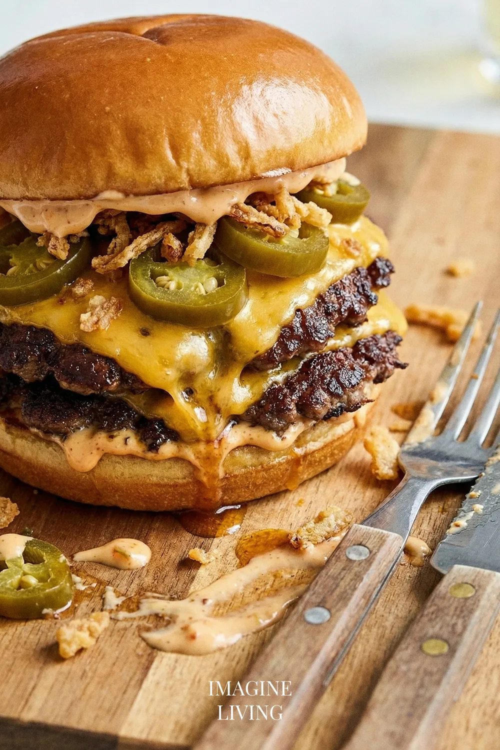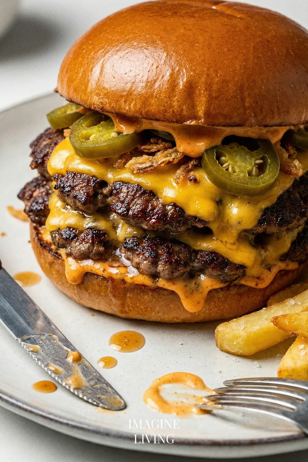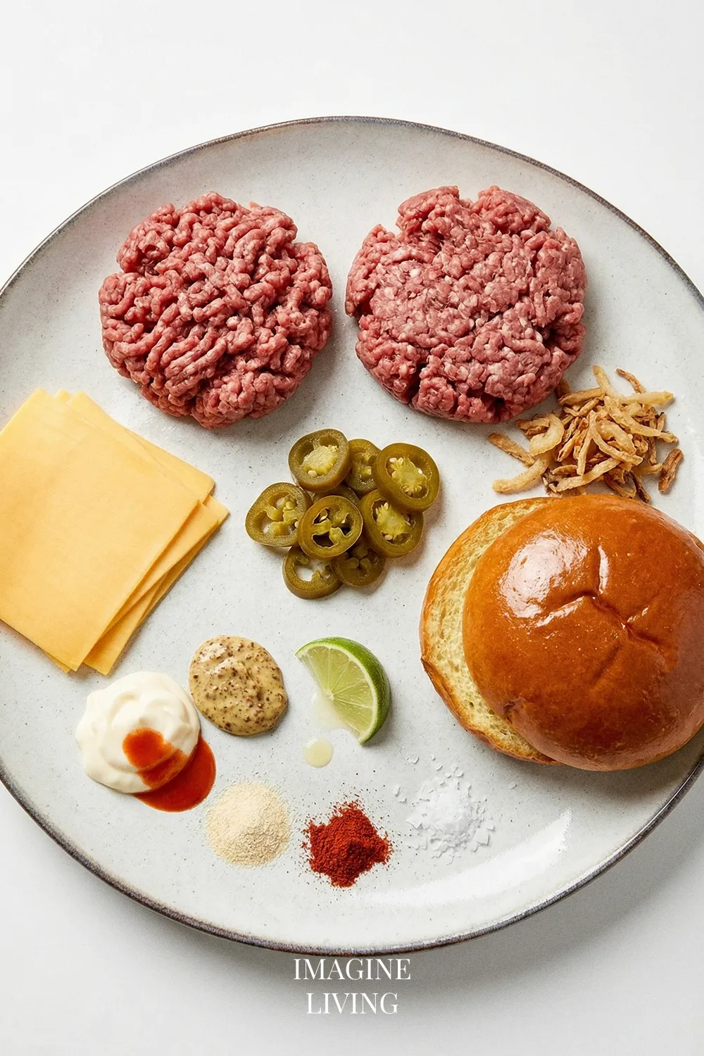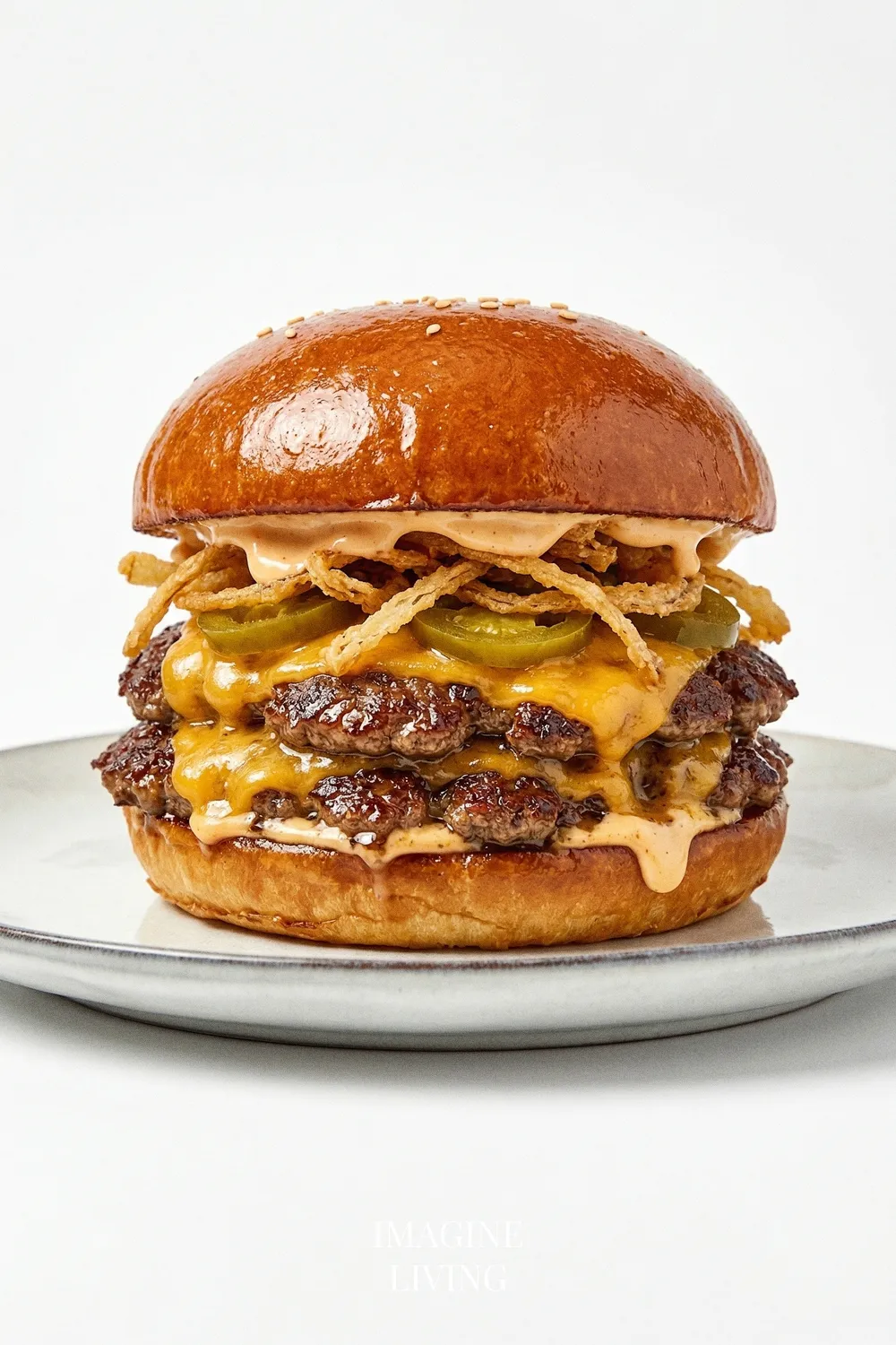 - Spread a generous amount of spicy mayo on the bottom half of each toasted bun. Top with a cheesy patty, followed by pickled jalapeños and crispy onions. Finish with the top half of the bun.